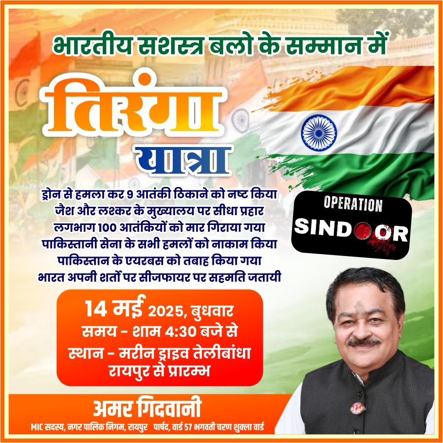 RV cg news राजू वासवानी, रायपुर :13/ मई /2025 मरीन ड्राइव, तेलीबांधा से कल निकलेगी तिरंगा यात्रा...