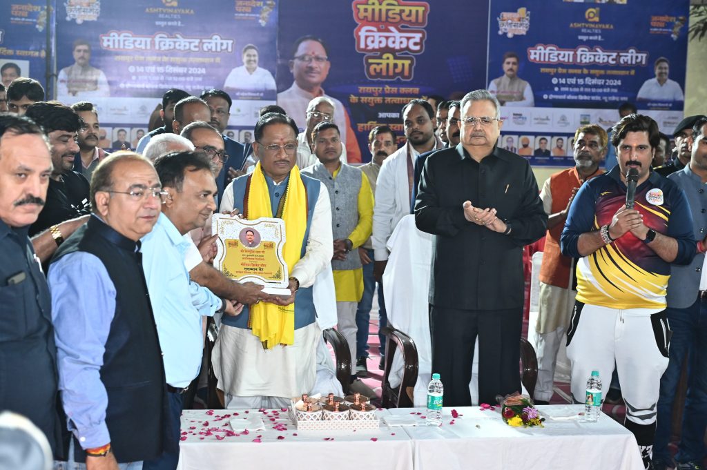 रायपुर-CA अमित चिमनानी के नेतृत्व में एवं रायपुर प्रेस क्लब के संयुक्त तत्वाधान में व समाजसेवी सहयोगी संस्थाओं द्वारा क्रिकेट लीग का शानदार आयोजन किया गया। छत्तीसगढ़ के मुख्यमंत्री विष्णु देव साय ने हाथ में बला थामने के बाद क्रिकेटर के रूप में नजर आए। उन्होंने प्रोफेशनल खिलाड़ियों की तरह शानदार शॉट खेले। फिर बारी आई पूर्व मुख्यमंत्री डॉ रमन सिंह की, वे भी किसी माहिर खिलाड़ी की तरह गेंद को बाउंड्री के पार पहुंचाते नजर आए।
