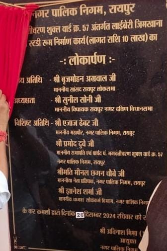 26.12.2024। रायपुर लोकसभा सांसद बृजमोहन अग्रवाल एवं रायपुर नगर दक्षिण विधायक सुनील कुमार सोनी रायपुर नगर निगम सभापति एवं पंडित भगवती चरण शुक्ल वार्ड के पार्षद प्रमोद दुबे ने पेंशन बाड़ा, बैरन बाजार, फौव्वारा चौक रायपुर में हमर अस्पताल एवं जिमखाना क्लब में नवनिर्मित लाईब्र्रेरी भवन का लोकार्पण किया।