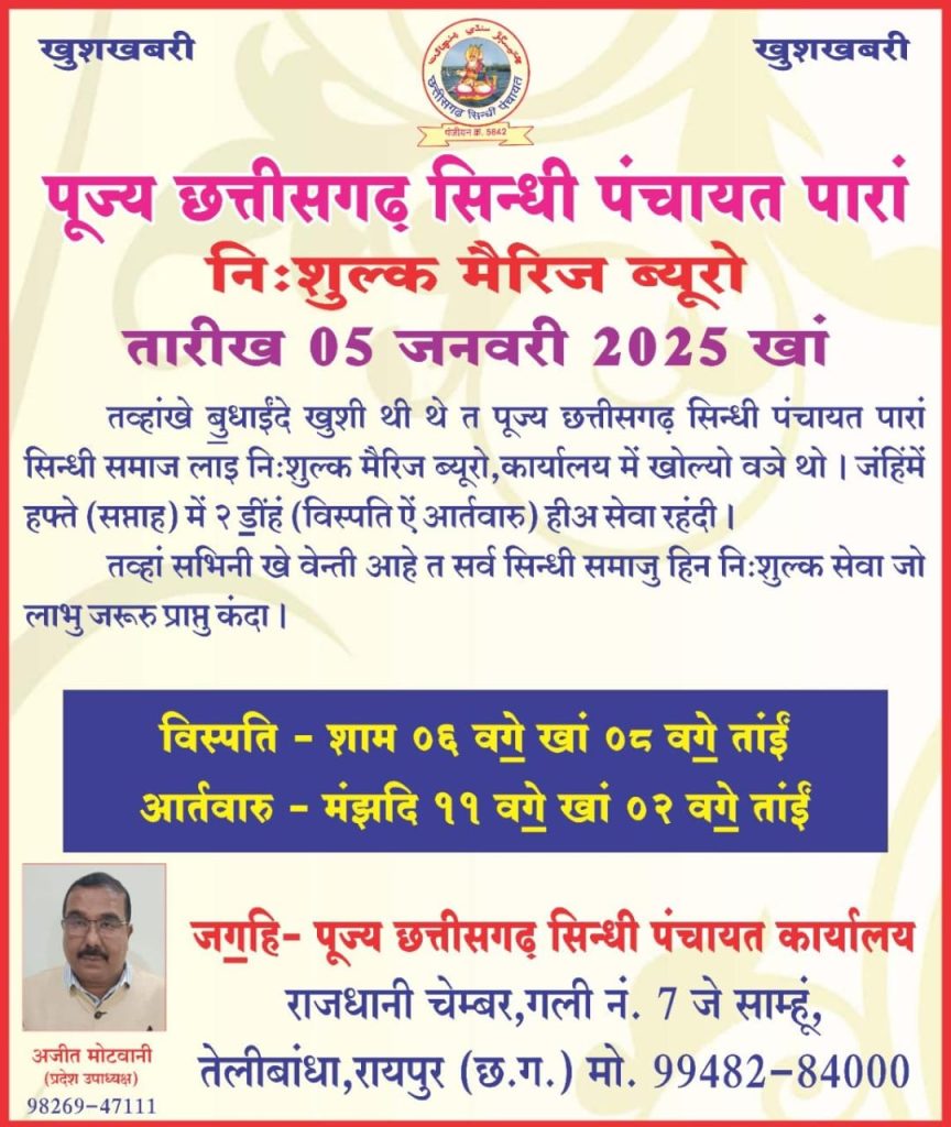 Feature छत्तीसगढ़ रायपुर सामाजिक छत्तीसगढ़ सिंधी पंचायत द्वारा नए वर्ष की एक नई शुरुआत 101 कन्याओं के बायोडाटा के साथ नि:शुल्क मैरिज ब्यूरो का उद्घाटन -RV cg news राजू वासवानी रायपुर RVCG news January 5, 2025 राजू वासवानी, रायपुर.5/जनवरी/2025 छत्तीसगढ़ सिंधी पंचायत द्वारा नए वर्ष की एक नई शुरुआत 101 कन्याओं के बायोडाटा के साथ नि:शुल्क मैरिज ब्यूरो का उद्घाटन -RV cg news राजू वासवानी रायपुर। Post Views: 541 Post navigation Previous महाकुंभ में सिंधी समाजसेवियों की संत साईं मसंद साहिब के नेतृत्व में शंकराचा शंकराचारर्यों के साथ होगी बैठक-RV cg news राजू वासवानी रायपुरNext सिंधी काउंसिल का आयुष्मान कार्ड शिविर राधास्वामी नगर रायपुर में-RV cg news राजू वासवानी रायपुर Related Stories ट्रांसपोर्ट सेक्टर को नई रफ्तार—छत्तीसगढ़ चेम्बर ऑफ कॉमर्स एंड इंडस्ट्रीज में “ट्रांसपोर्ट चेम्बर” का गठन, हरचरण सिंह साहनी बने अध्यक्ष, नई कार्यकारिणी की घोषणा Feature छत्तीसगढ़ रायपुर व्यापार ट्रांसपोर्ट सेक्टर को नई रफ्तार—छत्तीसगढ़ चेम्बर ऑफ कॉमर्स एंड इंडस्ट्रीज में “ट्रांसपोर्ट चेम्बर” का गठन, हरचरण सिंह साहनी बने अध्यक्ष, नई कार्यकारिणी की घोषणा April 18, 2026 “‘सुहिणी सोच पिकनिक 2026’ बनी यादगार—हंसी, मस्ती और अपनत्व के बीच हर्षोल्लास से हुआ आयोजन संपन्न, मनीषा तारवानी व पल्लवी चिमनानी के मार्गदर्शन में तंबोला-गेम्स और रेन डांस की धूम” Feature छत्तीसगढ़ रायपुर सामाजिक “‘सुहिणी सोच पिकनिक 2026’ बनी यादगार—हंसी, मस्ती और अपनत्व के बीच हर्षोल्लास से हुआ आयोजन संपन्न, मनीषा तारवानी व पल्लवी चिमनानी के मार्गदर्शन में तंबोला-गेम्स और रेन डांस की धूम” April 17, 2026 इंस्टा स्टार से सट्टा किंग तक! रायपुर का बाबू खेमानी मुंबई से गिरफ्तार — IPL पर होटल से चला रहा था लाइव सट्टा रैकेट Feature छत्तीसगढ़ जुर्म रायपुर इंस्टा स्टार से सट्टा किंग तक! रायपुर का बाबू खेमानी मुंबई से गिरफ्तार — IPL पर होटल से चला रहा था लाइव सट्टा रैकेट April 17, 2026