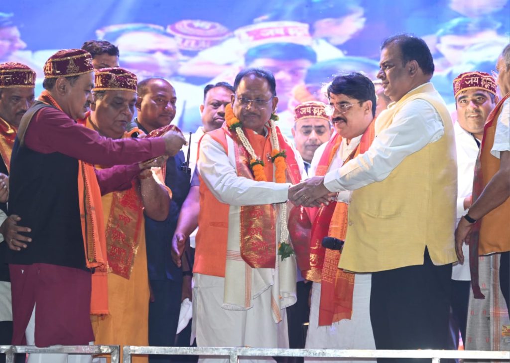 सिंधी काउंसिल द्वारा होजमालों के मंच पर मुख्यमंत्री विष्णुदेव साय एवम बीजेपी प्रदेश अध्यक्ष किरणदेव बृजमोहन अग्रवाल झूलेलाल जयंती की शोभायात्रा में शामिल हुए।