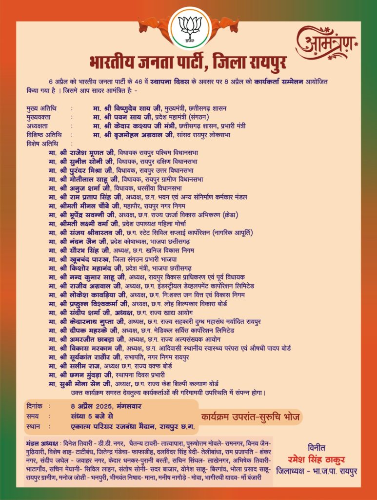 भाजपा स्थापना दिवस पर रायपुर शहर जिला द्वारा आयोजित कार्यकर्ता सम्मेलन में शामिल होंगे मुख्यमंत्री एवं संगठन महामंत्री