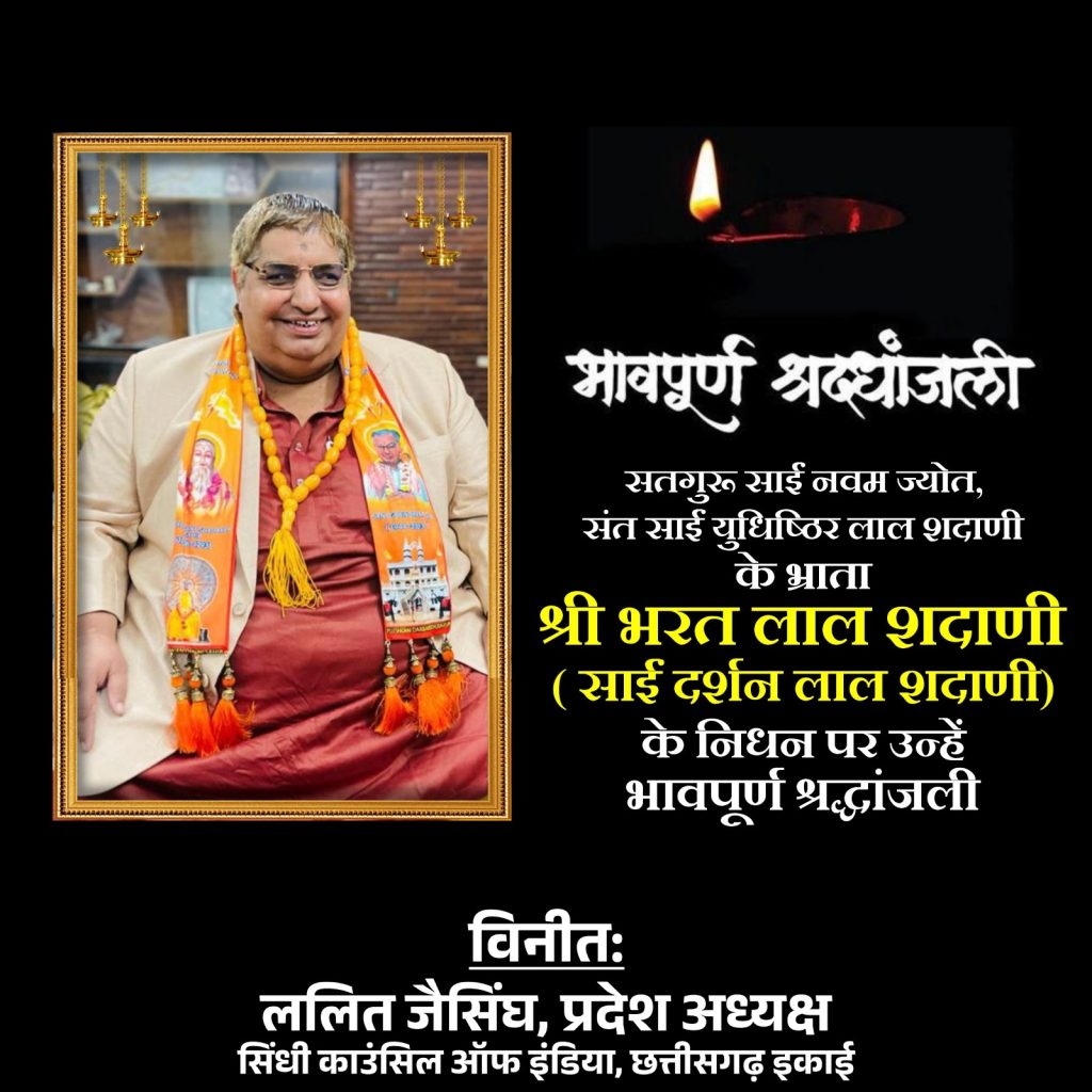 शदाणी दरबार तीर्थ के पूज्य संत युधिष्ठिर लाल जी के भाई स्व दर्शनलाल जी का आज सुबह स्वर्गवास हो गया जिनका पार्थिक शरीर दोपहर 2 से 4 बजे तक दर्शन के लिए रखा जाएगा उसके बाद उनकी अंतिम यात्रा शाम 4 बजे निकलेगी सिंधी काउंसिल के प्रदेश अध्यक्ष ललित जैसिंघ ने श्रद्धांजलि अर्पित की और कहा ईश्वर उनकी आत्मा को शांति प्रदान करे। सतगुरू साईं नवम ज्योत, संत साईं युधिष्ठिर लाल शदाणी के भ्राता श्री भरत लाल शदाणी( साईं दर्शनलाल शदाणी) अपनी सांसारिक यात्रा पूर्ण करके प्रभु चरणों में लीन हो गए है