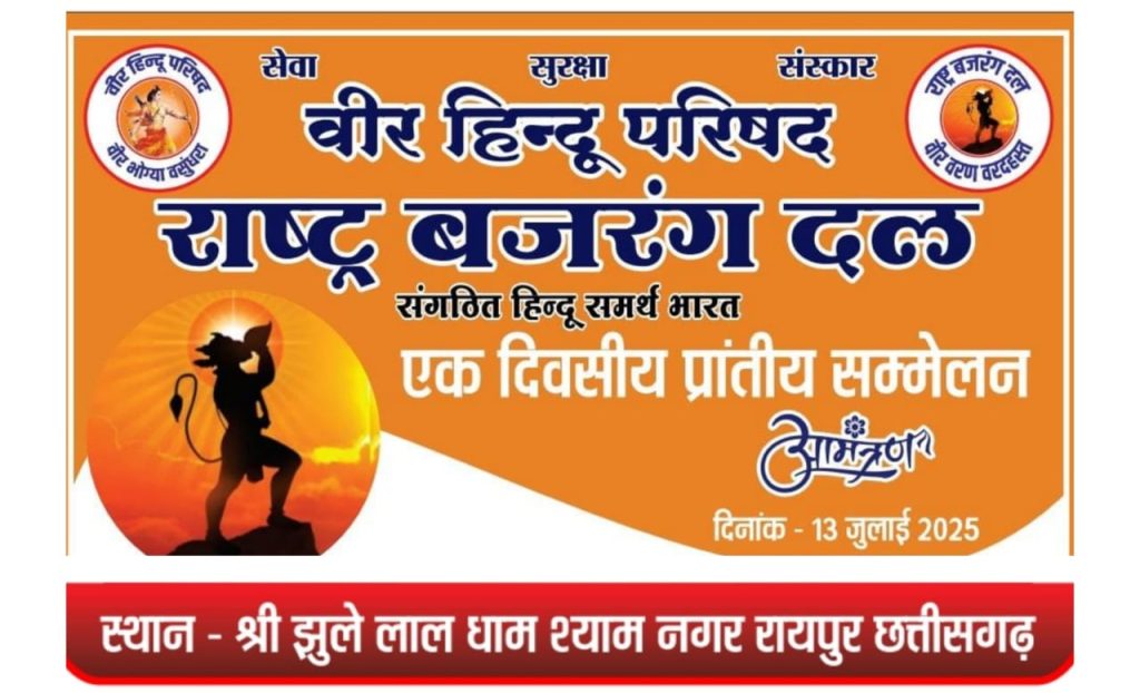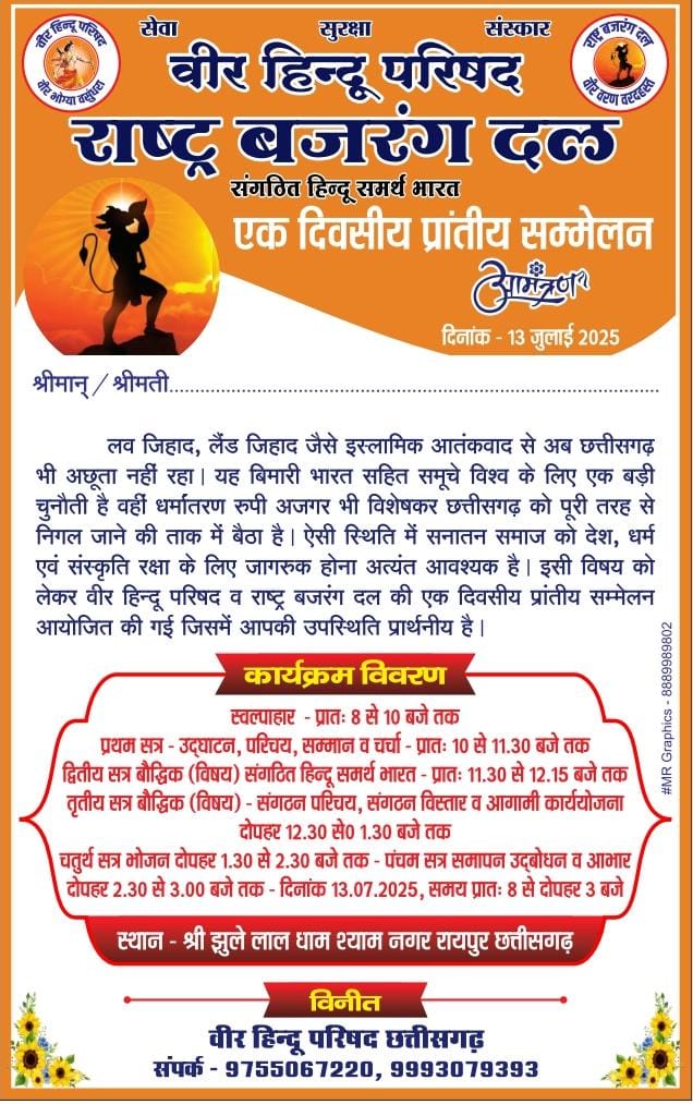छत्तीसगढ़ में बढ़ते लव जिहाद और लैंड जिहाद जैसे विषयों को लेकर वीर हिंदू परिषद एवं राष्ट्र बजरंग दल द्वारा एक दिवसीय प्रांतीय सम्मेलन आयोजित किया गया। इस सम्मेलन का उद्देश्य सनातन समाज को इन तथाकथित इस्लामिक चुनौतियों के प्रति जागरूक करना और धर्म, देश व संस्कृति की रक्षा के लिए संगठित प्रयासों को बढ़ावा देना था।