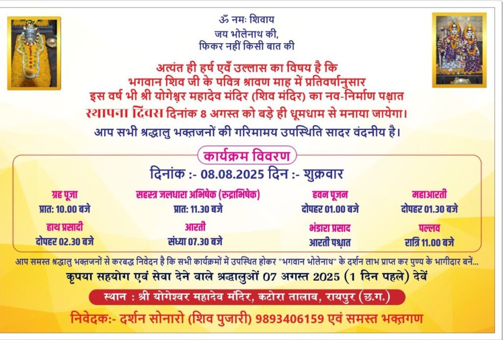 हर वर्ष की भांति इस वर्ष भी श्री योगेश्वर महादेव मंदिर के नव-निर्माण उपरांत स्थापना दिवस को भव्य श्रद्धा, भक्ति और उत्साह के साथ मनाया जाएगा।
