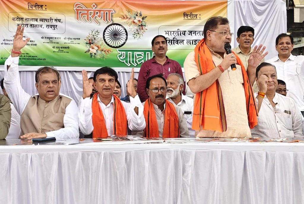 भाजपा सिविल लाइन मंडल रायपुर दक्षिण विधानसभा की तिरंगा यात्रा कालीमाता मंदिर से आरम्भ होकर कटोरा तालाब चौक में तिरंगा यात्रा का समापन हुआ रायपुर दक्षिण विधायक सुनील सोनी ने कहा 15 अगस्त के तीन दिन पूर्व पूरा माहौल तिरंगा मय हो गया।