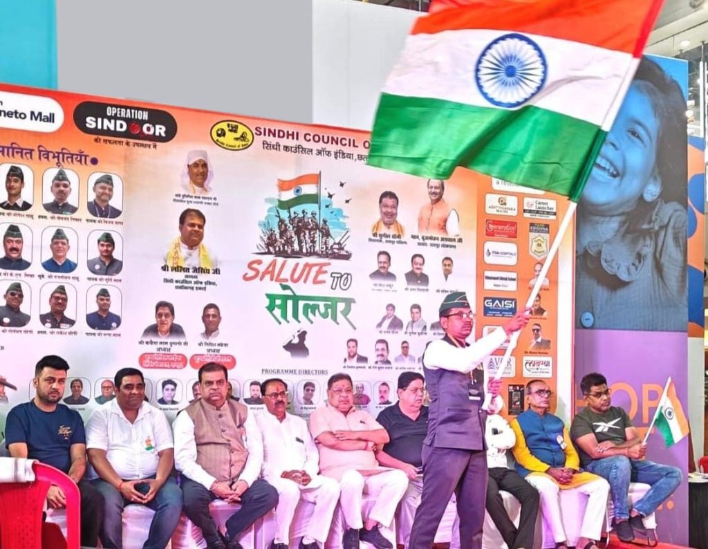 रायपुर। सिंधी काउंसिल ऑफ इंडिया छत्तीसगढ़ इकाई द्वारा मैग्नेटो मॉल रायपुर में ‘सेल्यूट टू सोल्जर’ कार्यक्रम का आयोजन किया गया। इस अवसर पर देश की सीमा पर सेवा दे चुके 12 सेवानिवृत्त सैनिकों को सम्मानित किया गया।