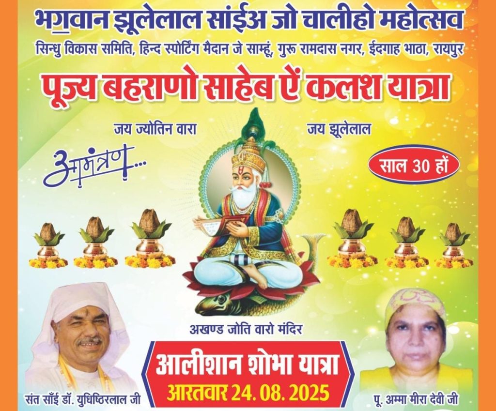 रायपुर। प्रतिवर्षानुसार इस वर्ष भी गुरु रामदास नगर, ईदगाह भाठा स्थित अखंड ज्योत वारों श्री झूलेलाल मंदिर में 30वां श्री झूलेलाल चालिहो महोत्सव बड़े ही हर्षोल्लास एवं धार्मिक उत्साह के साथ मनाया जा रहा है। यह आयोजन 16 जुलाई 2025 से प्रारंभ होकर 40 दिनों तक चलेगा तथा 24 अगस्त 2025 को सम्पन्न होगा।