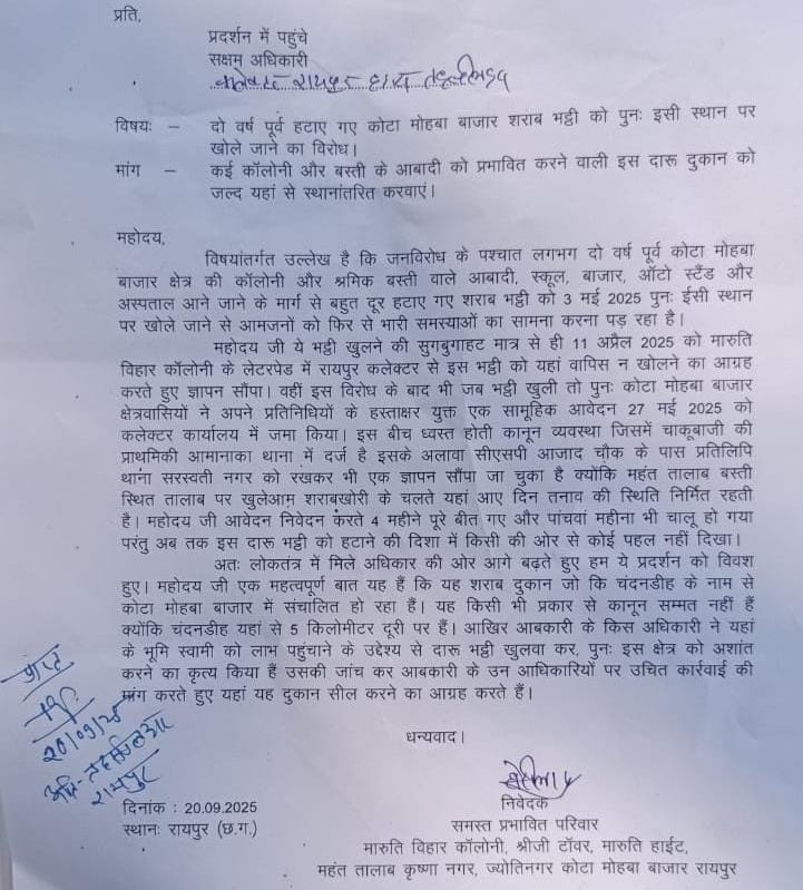 रायपुर/ विक्रम केवलानी ने प्रेस विज्ञप्ति जारी करके बताया कि कोटा मोहबा बाजार शराब भट्ठी जनविरोध के पश्चात लगभग दो वर्ष पूर्व मारुति स्काई के सामने से हटाए गए दारू दुकान के पुनः उसी स्थान पर वापिस खुल जाने से मारुति विहार कॉलोनी, श्रीजी टॉवर, मारुति हाईट, मारुति कुंज, शांति विहार, महंत तालाब कृष्णा नगर, ज्योति नगर कोटा सहित मोहबा बाजार के शिवाजी नगर, राजू नगर, डूमर तालाब, आमानाका कुकुरबेड़ा के नागरिकों में भारी रोष व्याप है ।