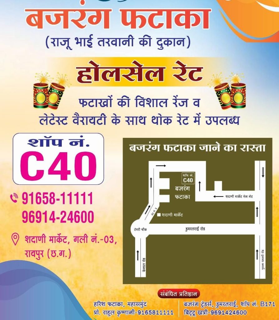 दुकान संचालक राजू भाई तरवानी एवं राहुल कृष्णानी ने बताया कि हरीश फटाका महासमुंद में वर्षों से ग्राहकों का विश्वास जीतता आ रहा है। अब इसी परंपरा को आगे बढ़ाते हुए रायपुर में “बजरंग फटाका” की शुरुआत की गई है।
