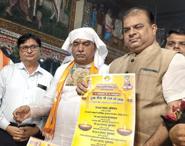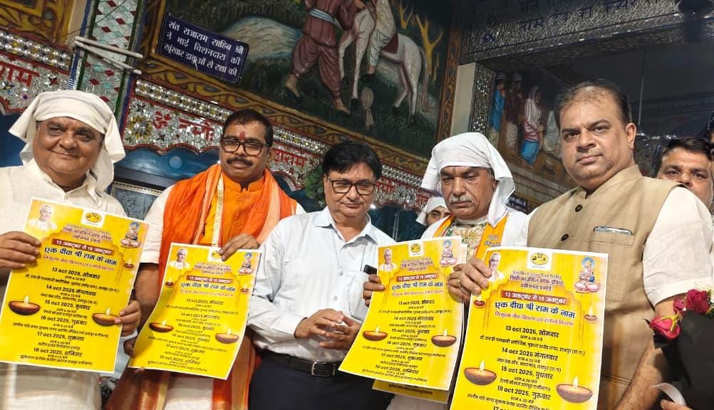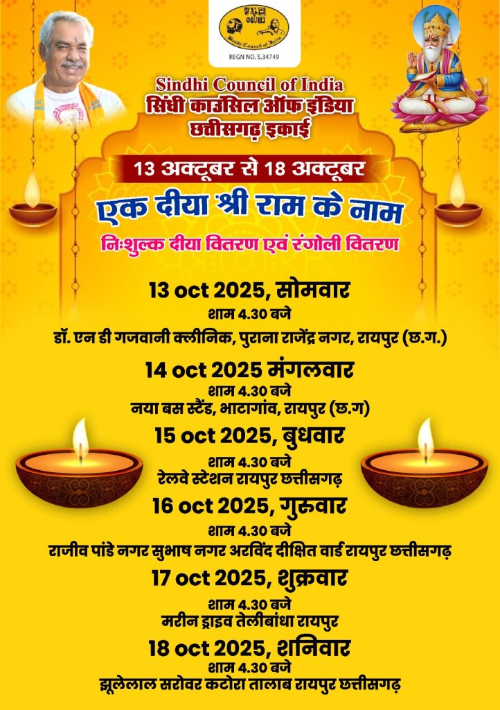सिंधी काउंसिल ऑफ इंडिया छत्तीसगढ़ इकाई द्वारा एक दीया श्रीराम के नाम का पोस्टर विमोचन शदाणी दरबार तीर्थ स्थल में पूज्य संत युधिष्ठिर लाल जी के द्वारा किया गया सिंधी काउंसिल के प्रदेश अध्यक्ष ललित जैसिंघ ने बताया 13 अक्टूबर से 18 अक्टूबर तक दीया एवम रंगोली निःशुल्क वितरण किया जाएगा आज के पोस्टर विमोचन में पूर्व विधायक श्रीचंद सुंदरानी ,