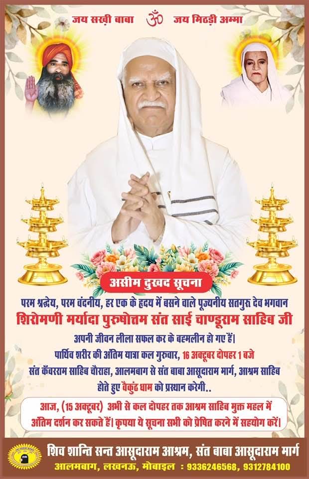 परम श्रद्धेय परम वंदनीय हर एक के हृदय में बसने वाले पूजनीय सतगुरु देव भगवान शिरोमणि मर्यादा पुरुषोत्तम संत साईं चाण्डूराम साहिब जी अपनी जीवन लीला सफल करके ब्रह्मलीन हो गए। पार्थिव शरीर की अंतिम यात्रा गुरुवार 16 अक्टूबर दोपहर 1:00 बजे संत कंवरराम साहिब चौराहा , आलमबाग से संत बाबा असूदाराम मार्ग , आश्रम साहिब होते हुए बैकुंठ धाम को प्रस्थान करेंगे