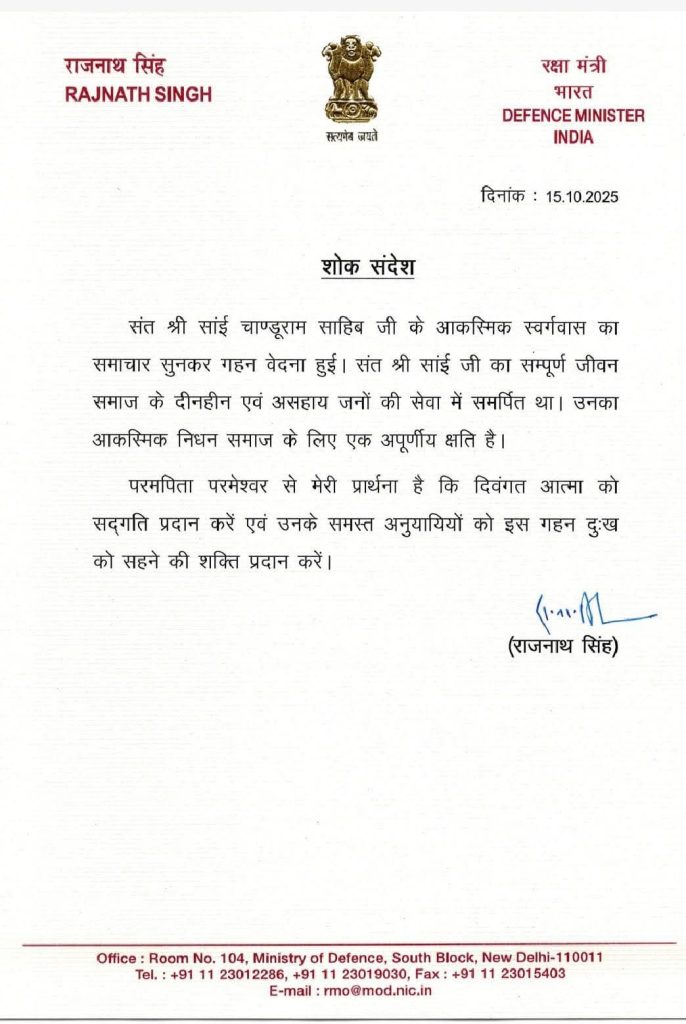 लखनऊ/रायपुर। 16/ अक्टूबर/2025- भारत के रक्षा मंत्री श्री राजनाथ सिंह ने पूज्य संत श्री साईं चांडूराम साहिब जी के आकस्मिक स्वर्गवास पर गहरी संवेदना व्यक्त की है।
