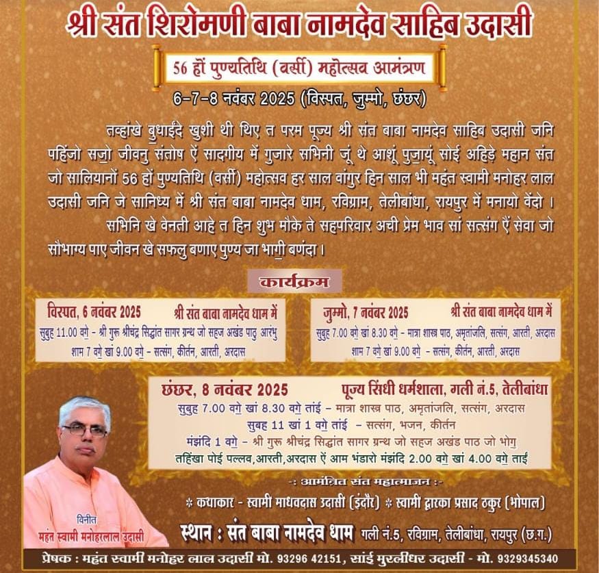 श्री संत बाबा नामदेव साहिब जी की 56वीं वार्षिक वर्सी एवं पुण्यतिथि महोत्सव — 6 से 8 नवम्बर तक रविग्राम रायपुर में भव्य आयोजन