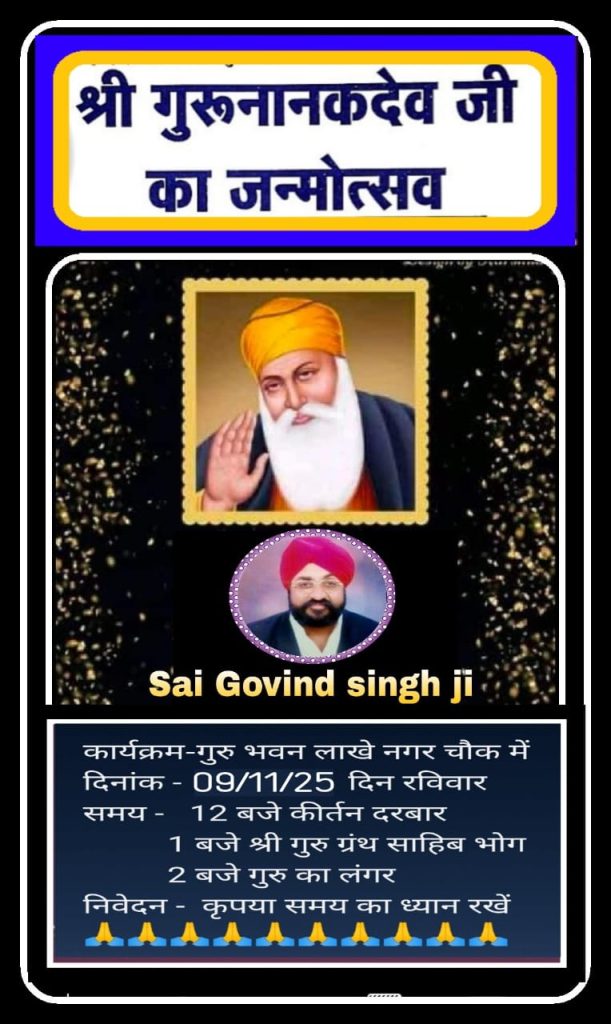 रायपुर। हर वर्ष की तरह इस वर्ष भी संत बाबा थाहिरिया सिंग संत बाबा सूरत सिंग दरबार गुरु भवन, लाखे नगर चौक में श्री गुरु नानक देव जी का जन्मोत्सव बड़े ही श्रद्धा और उत्साह के साथ मनाया जाएगा।