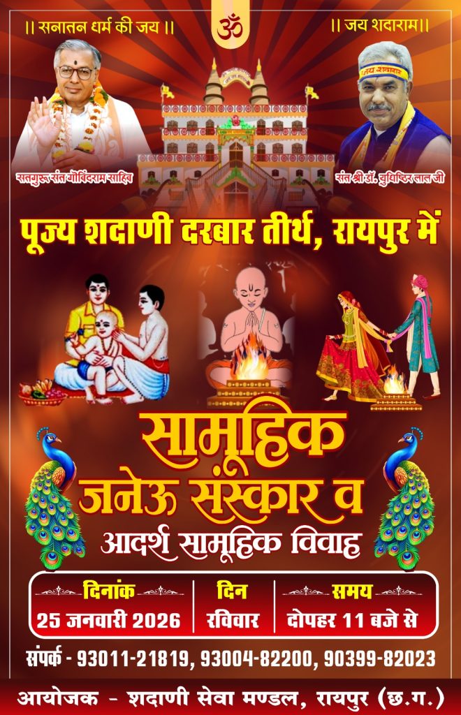 पूज्य शदाणी दरबार तीर्थ रायपुर में 25 जनवरी को सामूहिक जनेऊ संस्कार एवं आदर्श सामूहिक विवाह समारोह का भव्य आयोजन किया जाएगा। समाज उत्थान एवं संस्कार परंपरा के संरक्षण के उद्देश्य से आयोजित इस कार्यक्रम में संत महात्माओं के आशीर्वाद के साथ योग्य वर-वधुओं का विवाह संस्कार एवं बालकों का जनेऊ संस्कार संपन्न कराया जाएगा।