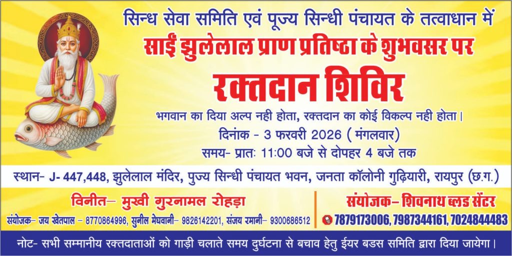 श्री साईं झूलेलाल प्राण प्रतिष्ठा के शुभ अवसर सिंध सेवा समिति एवं पूज्य सिंधी पंचायत जनता कॉलोनी एकता नगर गुढ़ियारी के तत्वाधान में रक्तदान शिविर का आयोजन भी किया जा रहा है जिसमें पंचायत के द्वारा मार्मिक अपील सभी लोगों से की जा रही है कि रक्तदान अवश्य करें व किसी के परिवार में होने वाली खुशियों का कारण बने अच्छा लगेगा।