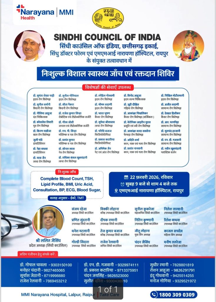 सिंधी काउंसिल ऑफ इंडिया छत्तीसगढ़ इकाई एवम सिंधु डॉक्टर फोरम के संयुक्त तत्वावधान में एम एम आई हॉस्पिटल रायपुर में 22 फरवरी 2026 निशुल्क स्वास्थ शिविर का आयोजन किया जा रहा है जिसका पोस्टर विमोचन एम एम आई हॉस्पिटल रायपुर में किया गया सिंधी काउंसिल के प्रदेश अध्यक्ष ललित जैसिंघ संजय रहेजा विक्की लोहाना सुनील कुकरेजा डॉक्टर एन डी गजवानी डॉक्टर सुनील धर्मानी अजीत कुमार बेलमकुंडा ईश्वर चंद देशमुख सतनाम सिंह हार्पित सिंह निलेश तारवानी रितेश वाधवा धनेश मटलानी जीतू लोहाना मनीष तलरेजा महिला विंग प्रदेश अध्यक्ष काजल सचदेव लक्ष्मी बजाज उपस्थित थे