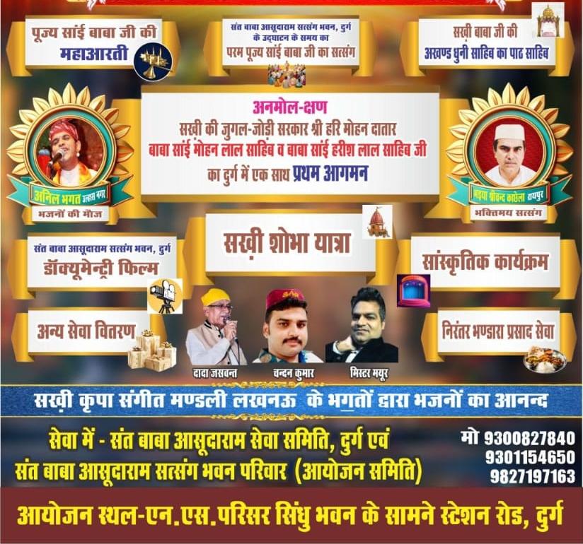 सन्त बाबा आसुदराम सत्संग भवन दुर्ग के 25 वर्षो की अखण्ड भक्ति सेवा, सत्संग का पावन अवसर सखी बाबा की जुगल जोड़ी सरकार श्री हरिमोहन दातार बाबा सांई मोहनलाल साहब एवं बाबा सांई हरिशलाल साहब जी कि पावन उपस्थिति में बडे हि धुमधाम से मनाया जा रहा है